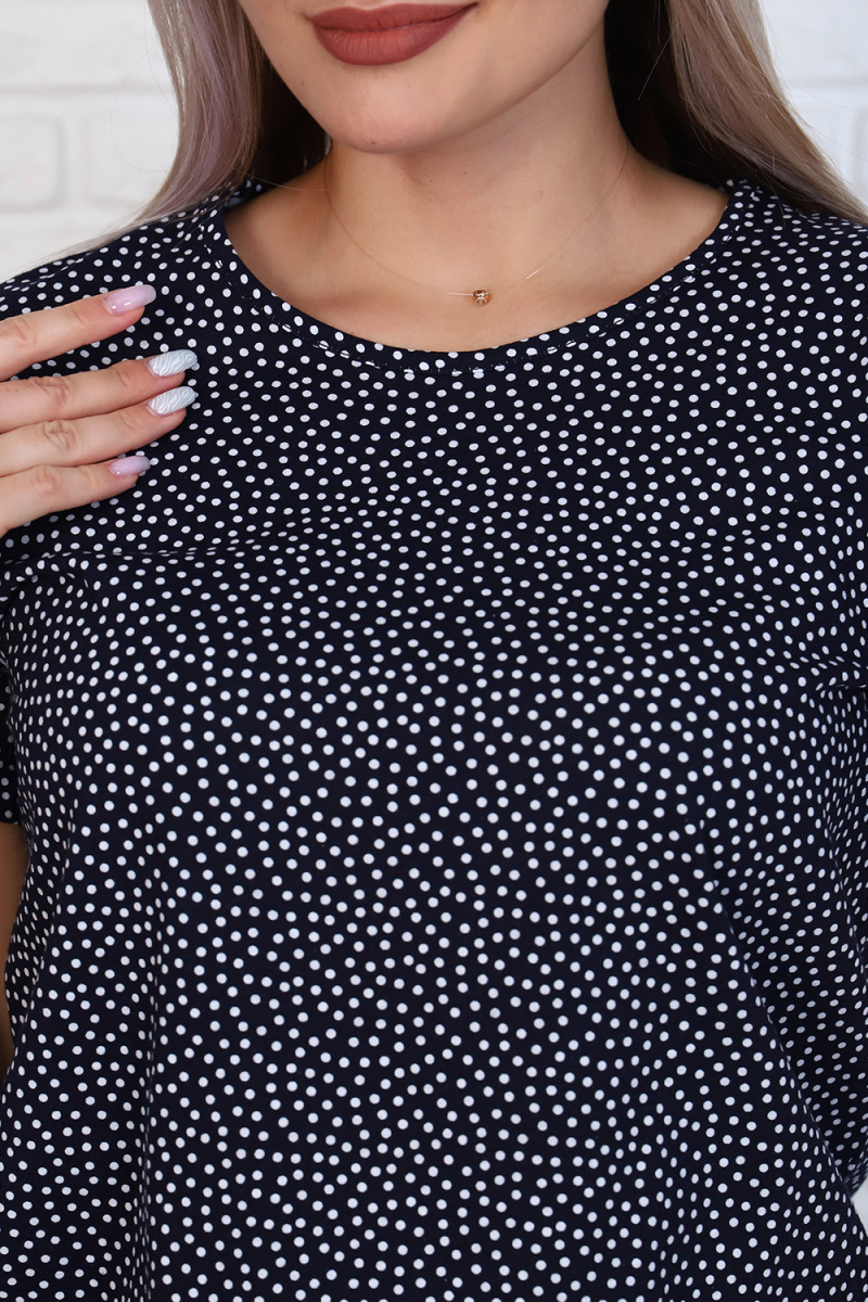 Костюм женский с шортами в горошек из кулирного полотна, футболка с коротким рукавом свободного силуэта, низ футболки обработан под резинку, шорты широкого покроя с карманами. Замечательный комплект для отдыха и повседневной носки.