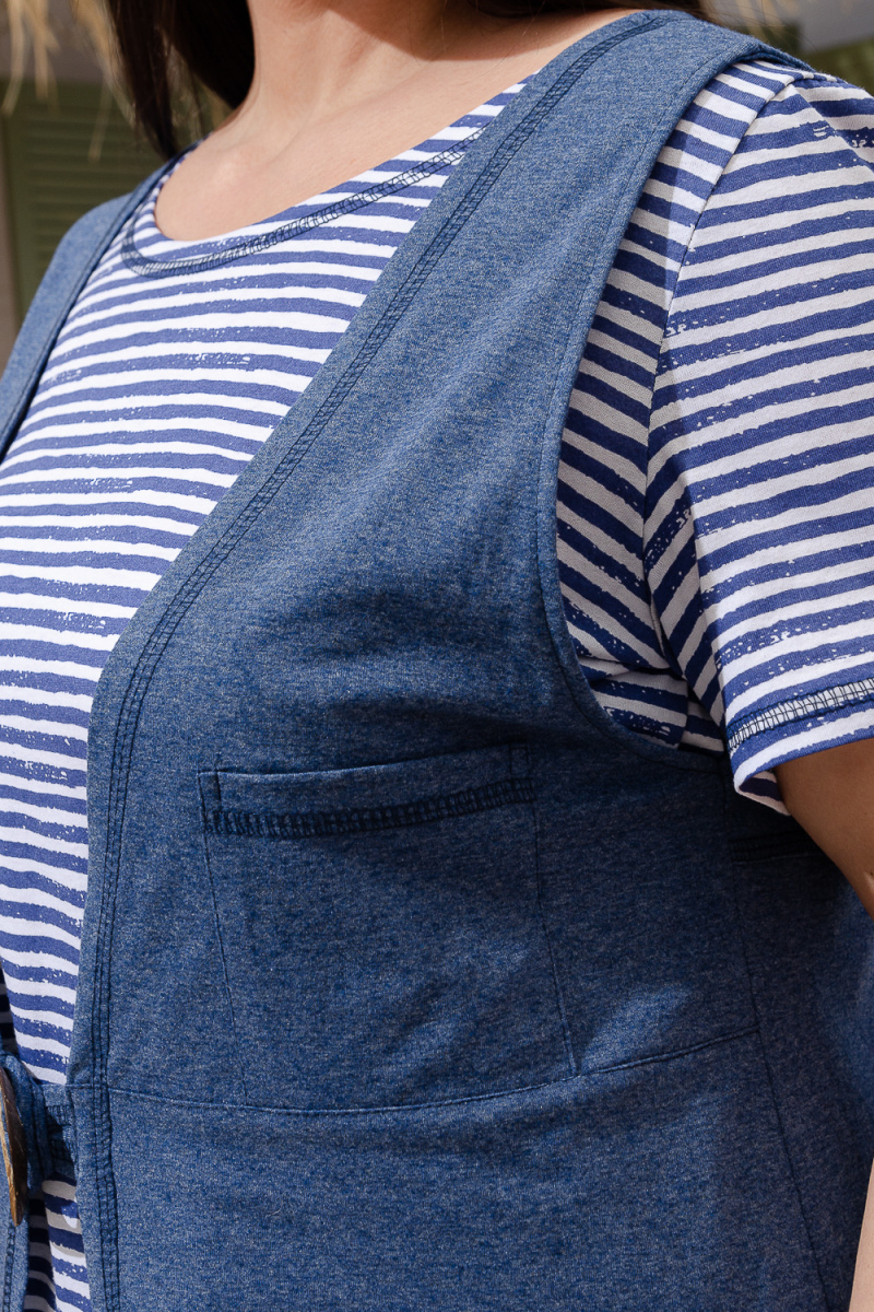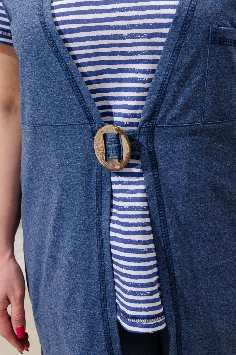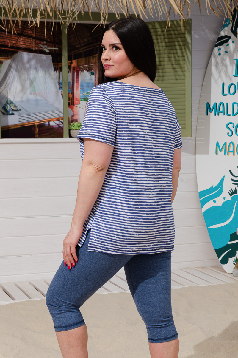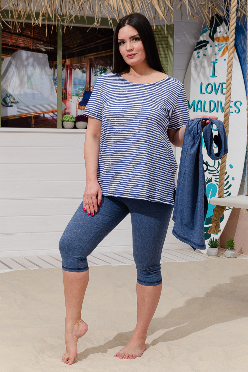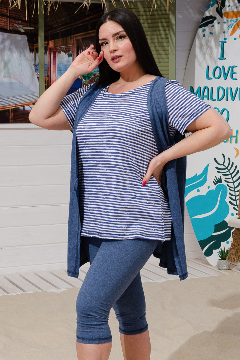 Костюм женский "тройка": Футболка, жилет, бриджи. Футболка с округлым вырезом, короткими рукавами и разрезами в боковых швах. Жилет прямого силуэта. Полочка и спинка из двух частей: верхней и нижней. Застежка на одну декоративную кокосовую пуговицу на уровне линии талии. Бриджи облегающие из х/б ткани с лайкрой.
